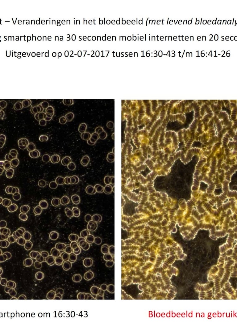 Deze schadelijke frequenties hebben een negatief effect hebben op de cellen in ons lichaam. Daar komt bij dat we deze overtollige straling vaak niet via onze blote voeten kwijt raken aan de aarde, omdat we allemaal rubberen zolen onder onze schoenen hebben. Dit zorgt ervoor dat de polariteit van de cellen wordt verstoord, hierdoor kunnen ze niet goed, opnemen en uitscheiden (ontgiften). We noemen dit geldrollen/rouleauvorming (zie foto) Als onze cellen aan elkaar plakken zoals je kunt zien op de foto’s en niet in evenwicht zijn kun je niet goed ontgiften en werkt de therapie niet of nauwelijks.